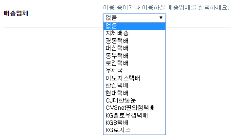 배송업체는 자체배송, 경동택배, 대신택배, 동부택배, 로젠택배, 우체국, 이노지스택배, 한진택배, 현대택배, CJ대한통운, CVSnet 편의점택배, KG옐로우캡택배, KGB택배, KG로지스가 있습니다.