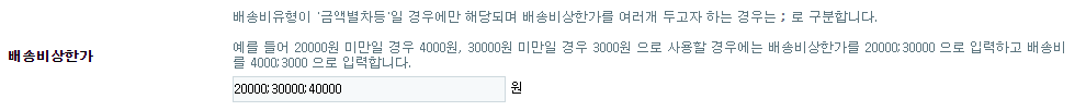 예를 들어 20000원 미만일 경우 4000원, 30000원 미만일 경우 3000원 으로 사용할 경우에는 배송비상한가를 20000;30000 으로 입력하고 배송비를 4000;3000 으로 입력합니다.