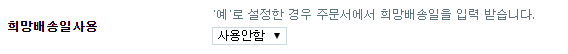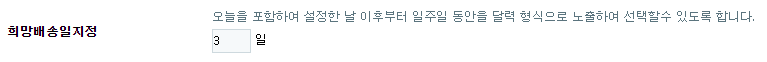 희망 배송일 사용에 '사용'으로 설정한 경우 주문서에서 희망배송일을 입력 받을 수 있습니다.