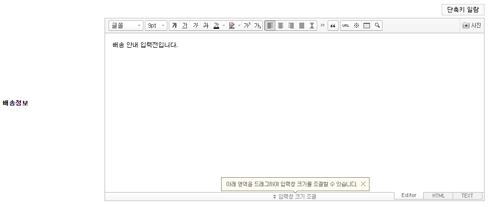 상품설명 페이지에서 배송 시 안내하는 문구를 적는 곳 입니다.
