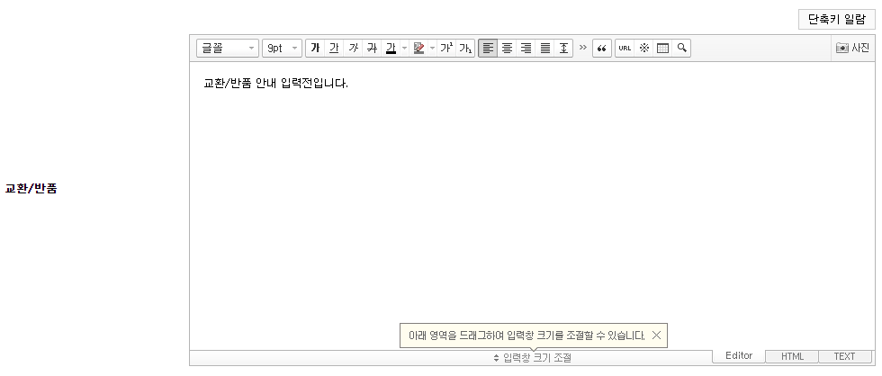상품설명 페이지에서 교환/반품 시 안내하는 문구를 적는 곳 입니다.