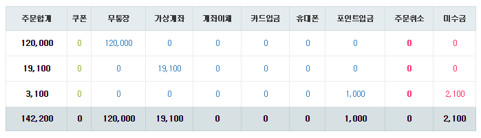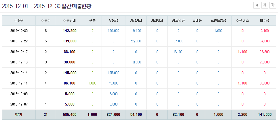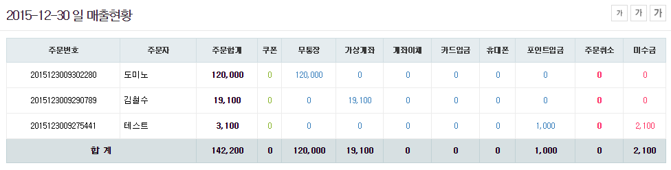 합계는 일일, 일간, 월간, 연간에서 주문수의 주문합계를 보여줍니다. 일일, 일간, 월간, 연간 등 매출 현황에 따라 주문합계 금액은 다르게 표시됩니다.
