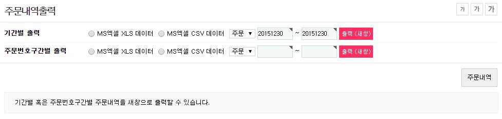 주문내역을 출력합니다. 출력 기본페이지 외에 XLS, CSV로도 출력할 수 있습니다.