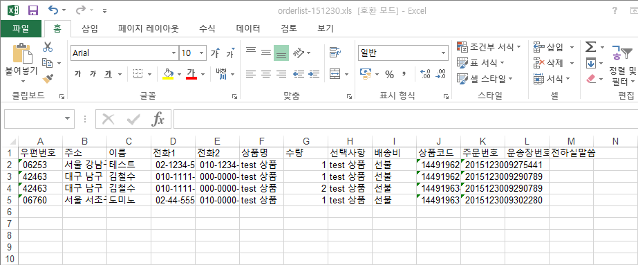 XLS나 CSV 데이터를 선택시 결과물을 다운로드 하여 조회 및 편집 할수 있으며 택배회사로 주문정보를 전달할 수 있습니다.