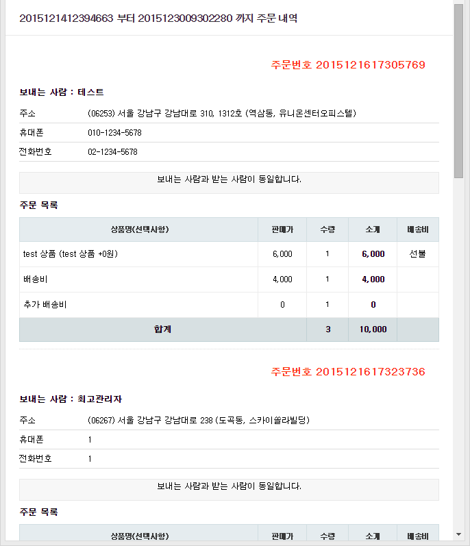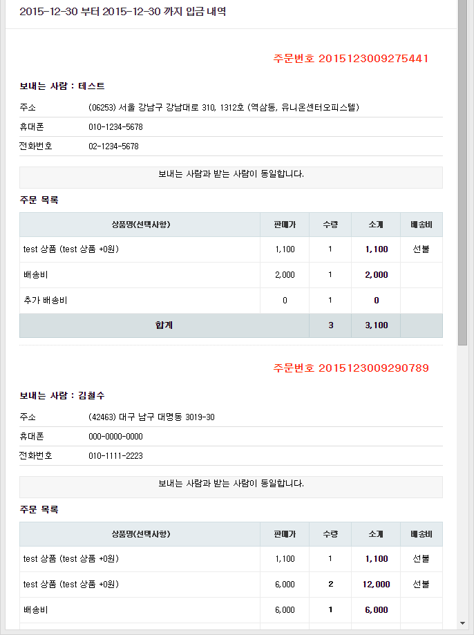 주문, 입금, 준비, 배송, 완료, 취소, 반품, 품절, 전체 등 기간을 검색하여 기간별 주문내역을 출력할 수 있습니다.