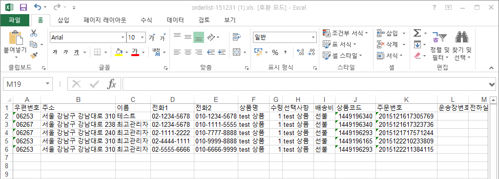 ■ 주문번호 구간별 출력 - MS 엑셀 XLS 데이터