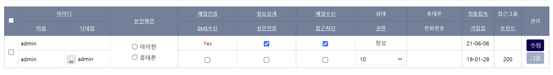 회원의 기본 정보인 비밀번호, 이름(실명), 닉네임, E-mail, 홈페이지, 휴대폰 번호, 전화번호가 있습니다. 회원 수정폼에서 관리자는 아이디를 제외한 나머지 모두 수정할 수 있습니다.