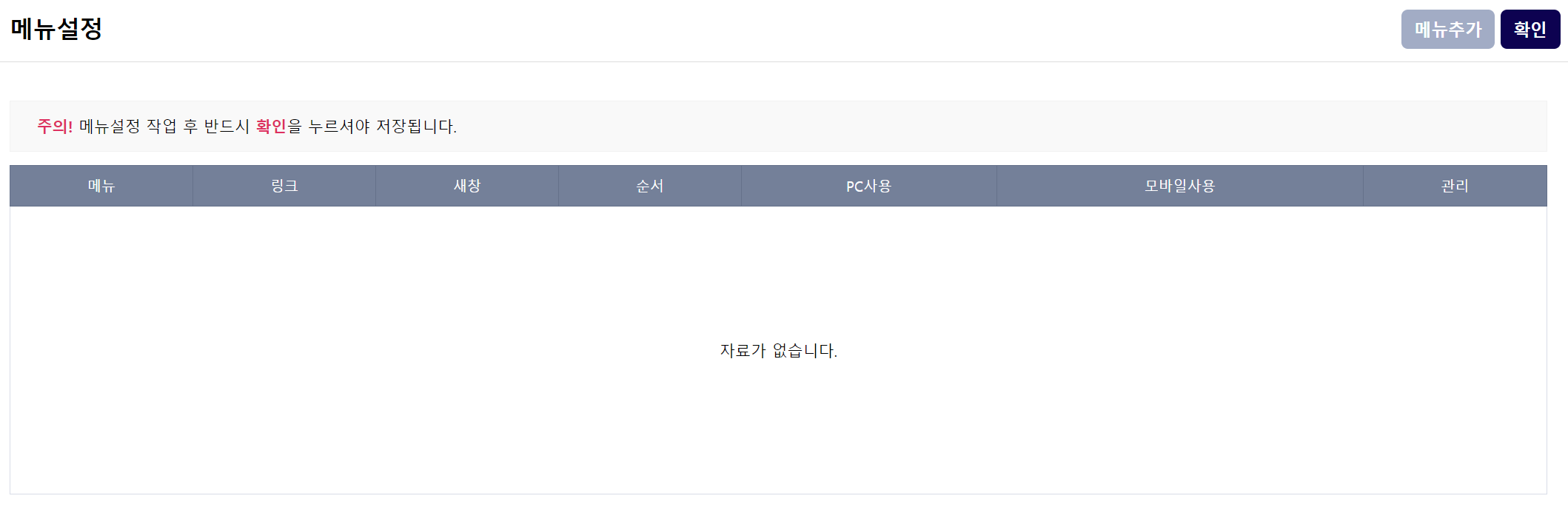 우측에 [확인] 버튼을 클릭하시면 메뉴가 적용이 완료됩니다.
