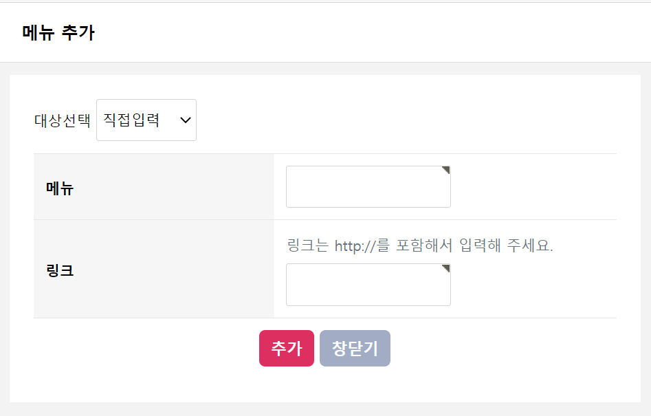 메뉴를 추가해보겠습니다. 우측 상단의 '메뉴 추가' 버튼을 클릭하세요.