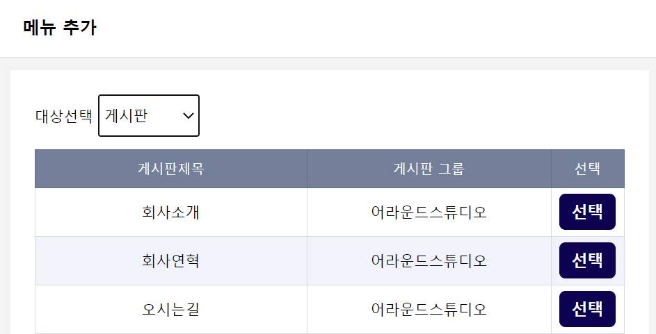 게시판 그룹이나 게시판은 '게시판 관리' 메뉴에 게시판이 추가되어있어야만 사용할 수 있습니다.