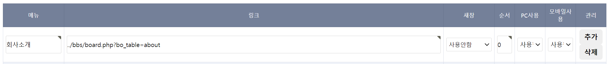 메뉴 색션에서 필요없는 메뉴를 우측 [삭제]를 클릭하여 메뉴 제거가 가능합니다.