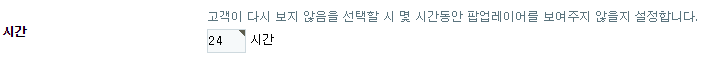 팝업의 '다시 보지 않음'을 선택할 때 몇 시간동안 팝업레이어를 보여주지 않을 지 설정합니다.