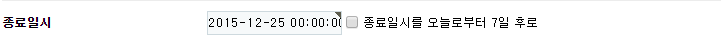 팝업의 종료 일시를 설정합니다. '종료일시를 오늘로부터 7일 후로'를 체크하여 오늘로부터 7일 후 팝업이 종료되게 할 수 있으며 사용자가 직접 종료 일시를 입력하여 설정할 수 있습니다.