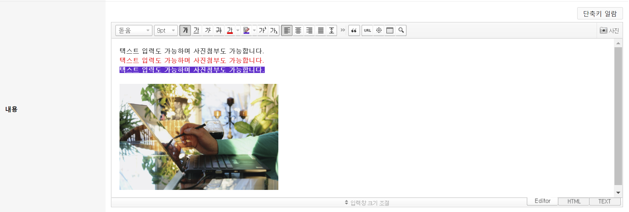 팝업 레이어에 들어갈 내용을 입력합니다. 내용에서는 글과 링크, 이미지 등을 추가할 수 있습니다.